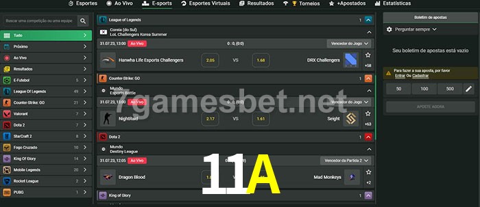 O 11A oferece uma grande seleção de opções de apostas em e-sports com probabilidades competitivas